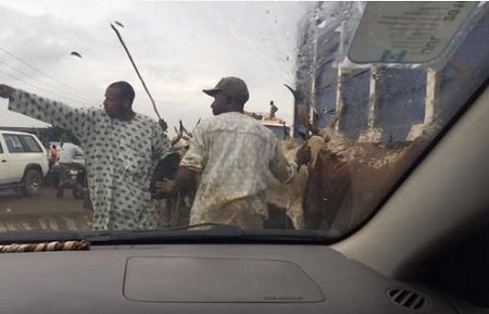 Cows caused hold up around the Agege/Abbatoir road in Lagos this morning, Monday, 14th of August as people ran around to avoid attack from the stray cows. An eyewitness said the cows harmed a lady and obstructed vehicular movement.